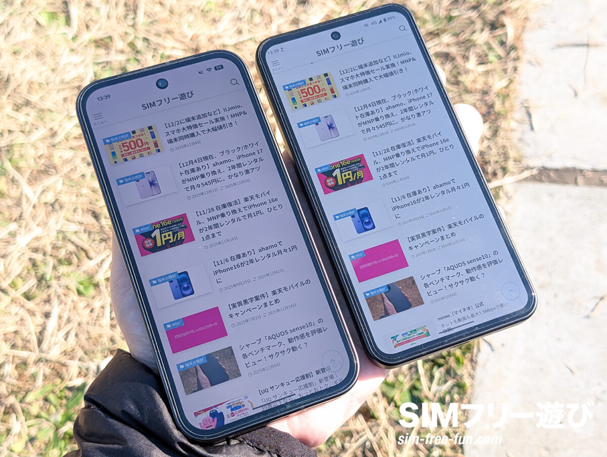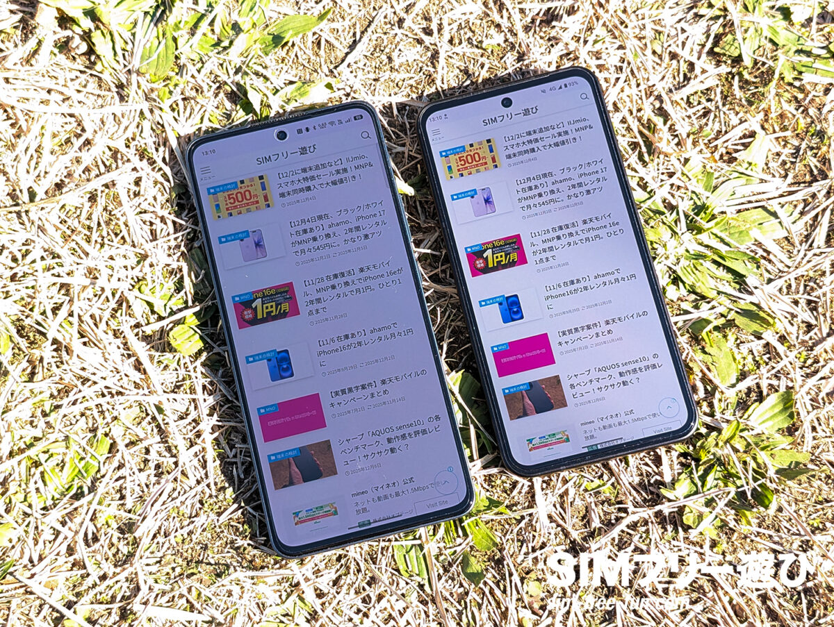 左がOPPO Reno13 A(1200nit)、右がAQUOS sense10。明らかにAQUOS sense10の方が明るい