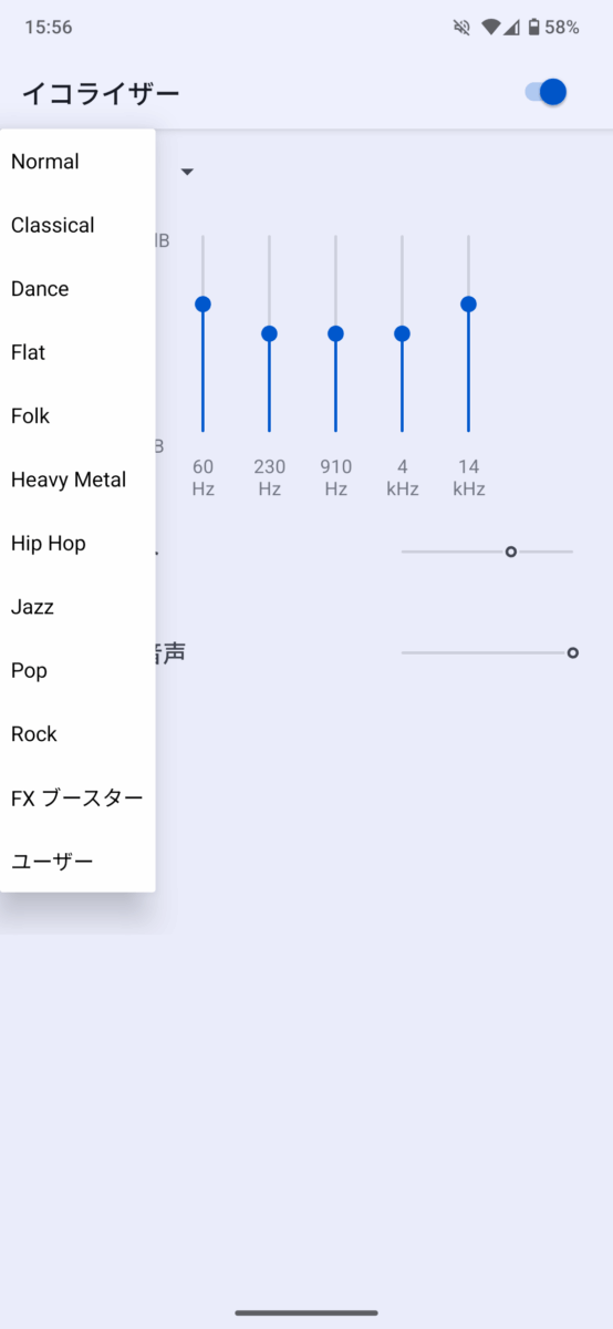 イコライザーは、サウンド効果を自分でカスタムすることが可能です。プリセットも用意されていました。