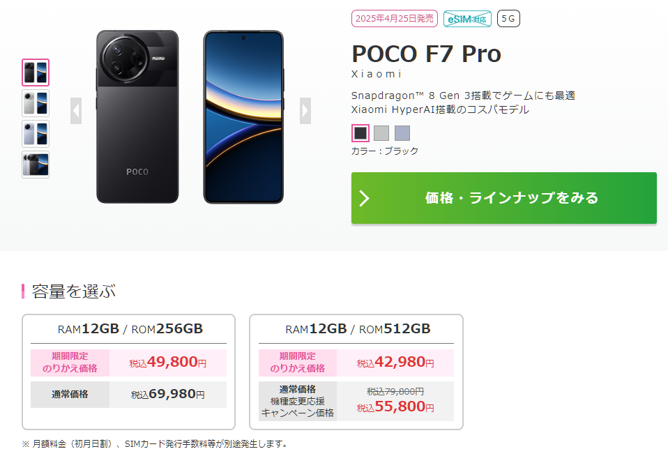 POCO F7 ProはAmazon、Xiaomi 公式 楽天市場店が主な販売元になっており、EC専用モデルとなっているため、家電量販店などの店頭では販売されていません。
