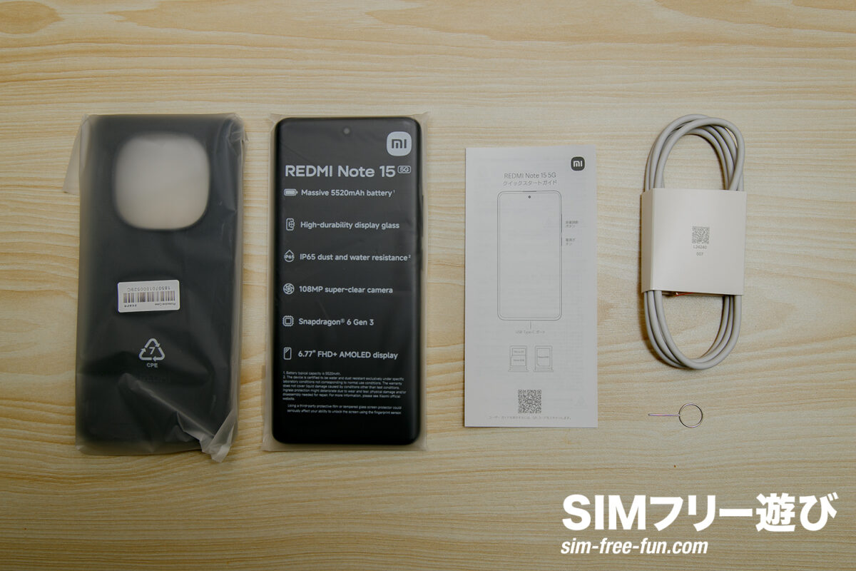 同梱物は、REDMI Note 15 5G本体の他にケース、SIMピン、USB Type-Cケーブル、説明書が含まれています。USB Type-Cケーブルがありますが充電器は付属していません。