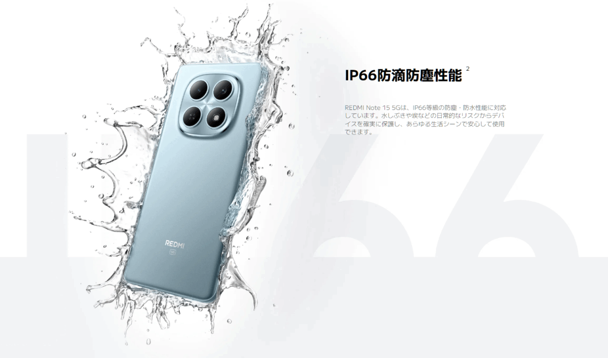 REDMI Note 15 5Gの防塵・防水機能は「IP66」と、ミドルレンジの中でも少し控えめです。多くのミドルレンジで「IP68」に対応しているため、デメリットの1つと言えそうです。