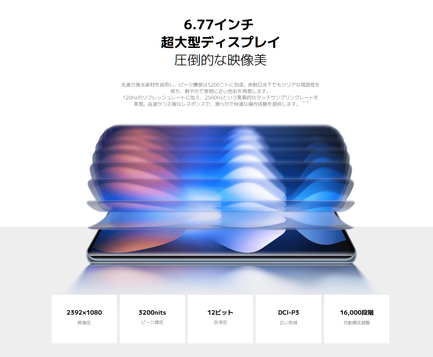 | ディスプレイ | 6.77インチ|有機EL(AMOLED)|3Dカーブディスプレイ |