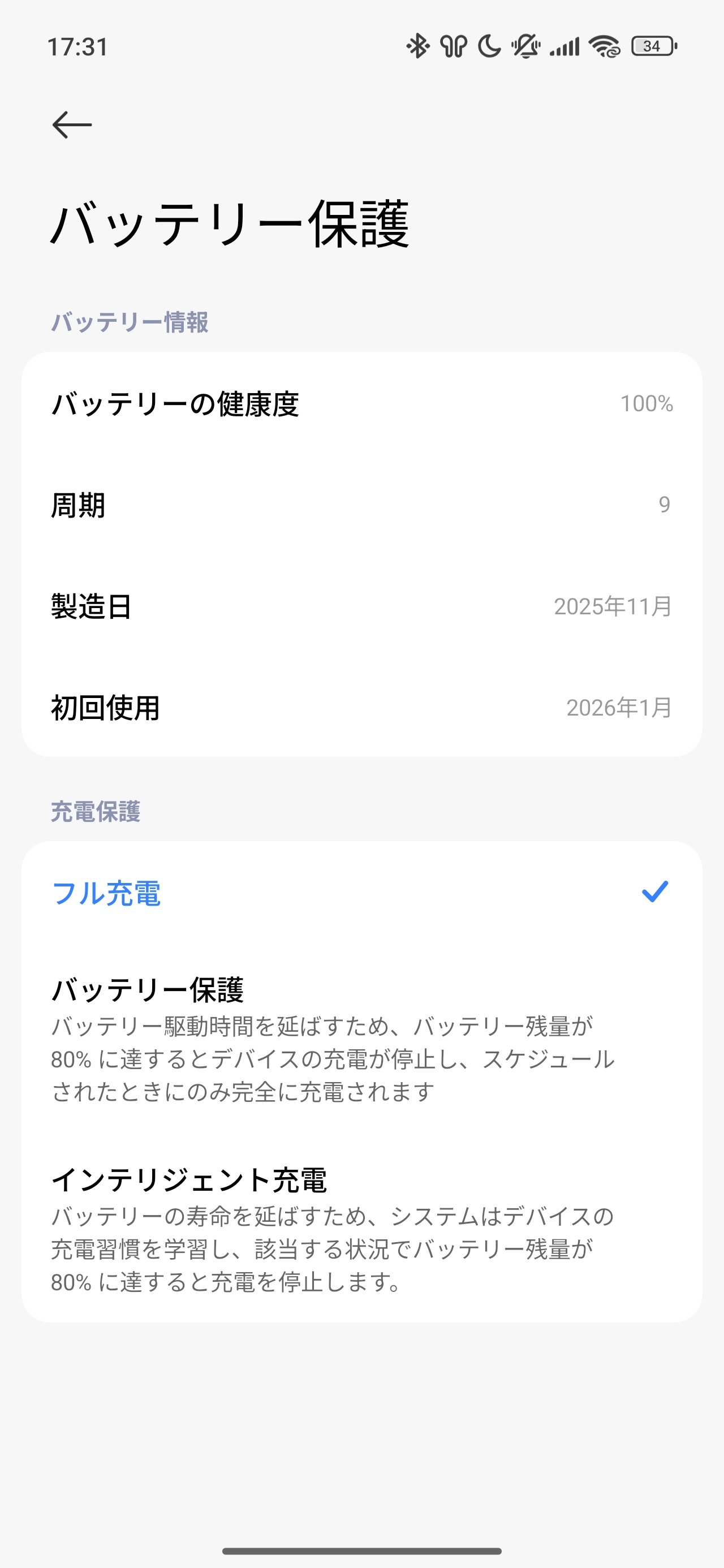 バッテリー保護の項目では、バッテリーの健康状態などを確認できる他、充電を80%までなどのバッテリー保護の項目があります。