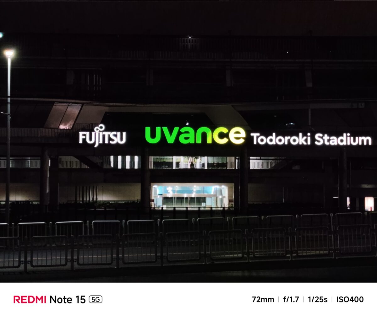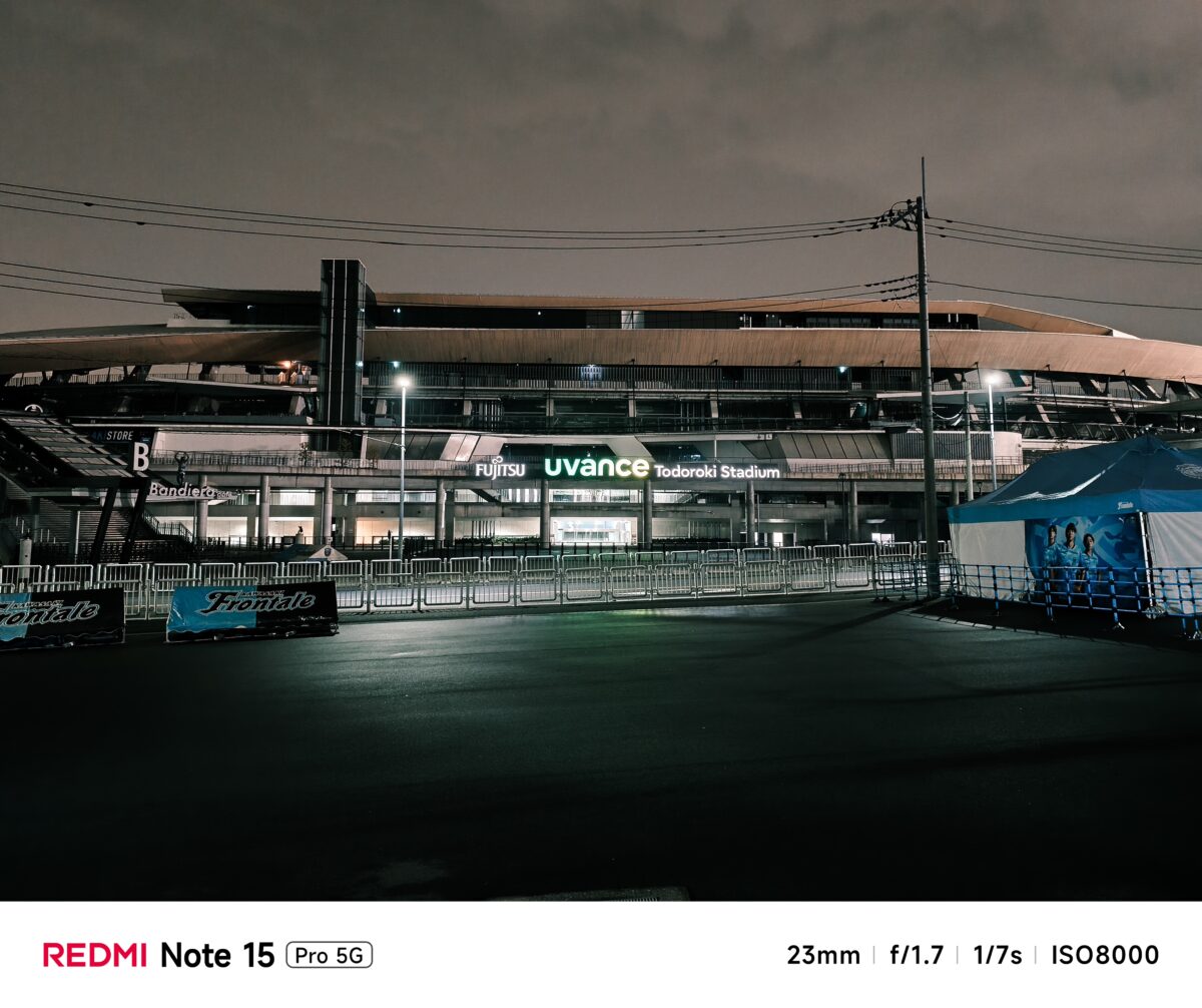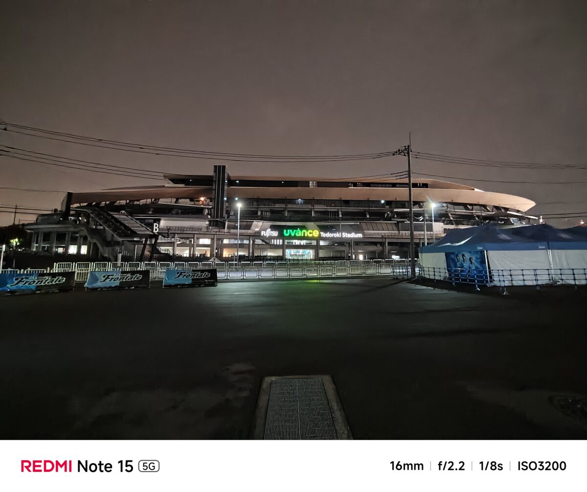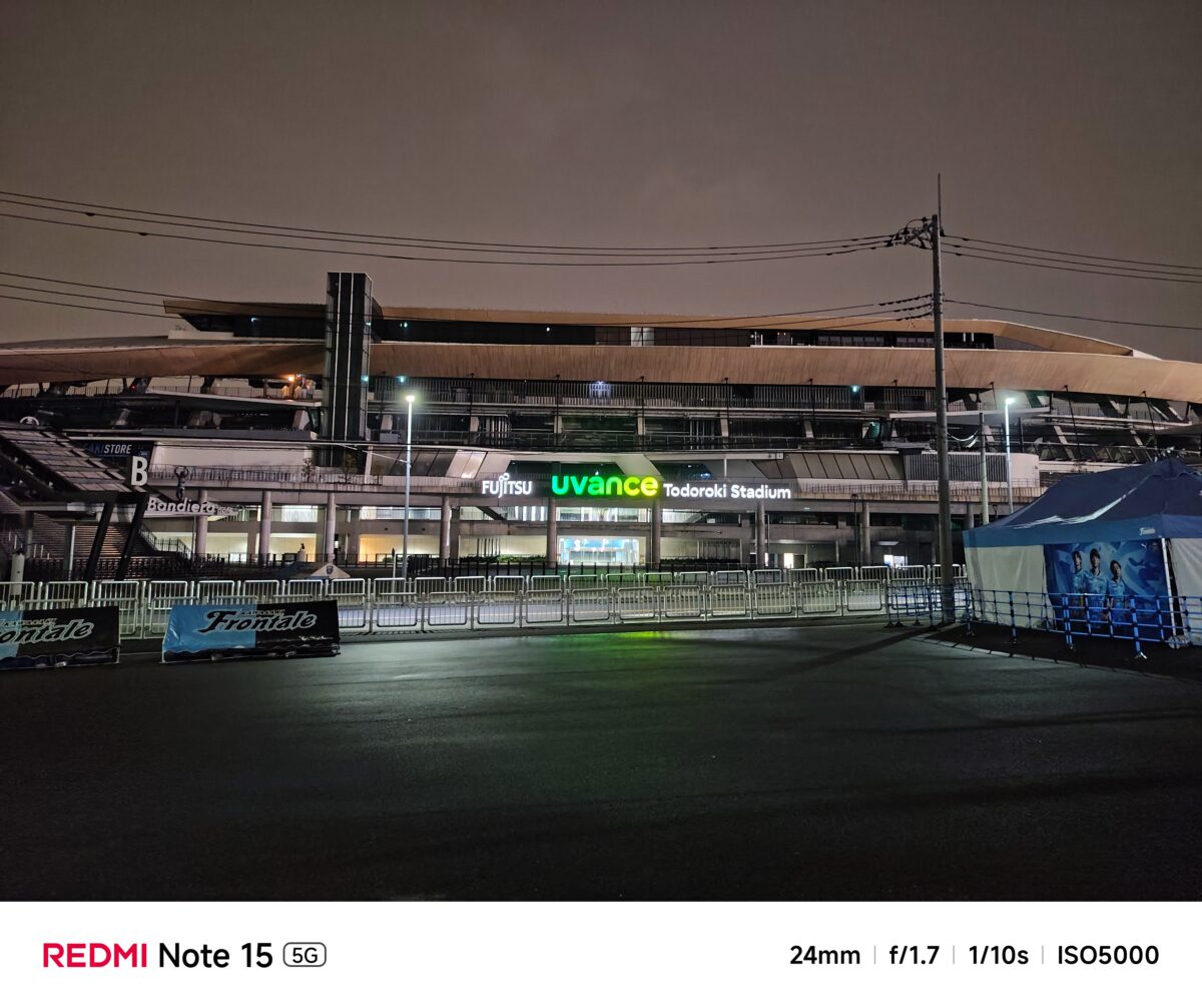 REDMI Note 15 5Gは全体的に画像が暗くなっています。Xiaomiのスマホには夜景モードがない(自動で夜景モードになる)のですが、この時は通常撮影モードになっていました。自動判定で傾向看板の影響で光量があると判断しているものと思われます。それによって、全体が暗い画像になったものと思われます。