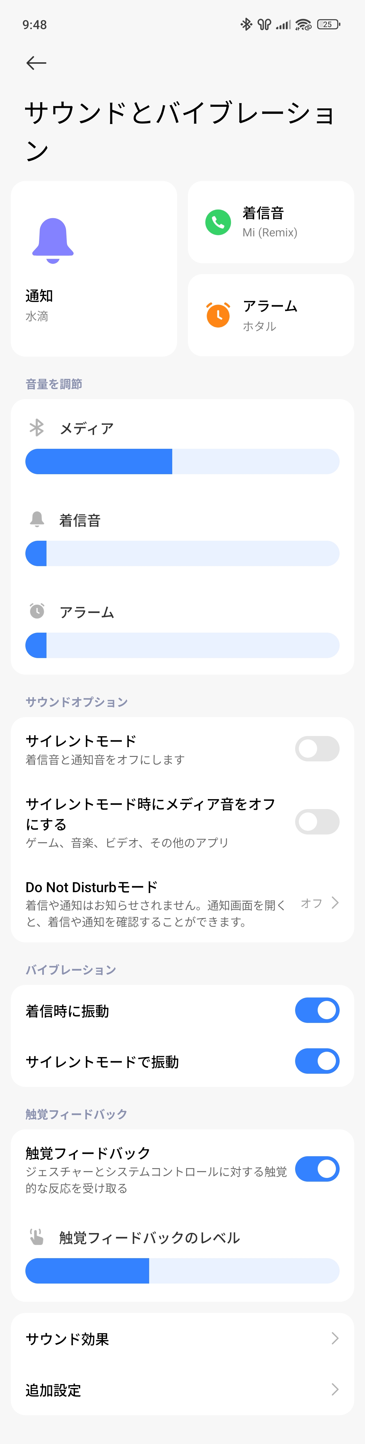 REDMI Note 15 Pro 5Gのサウンドとバイブレーションの設定は下記の通り。