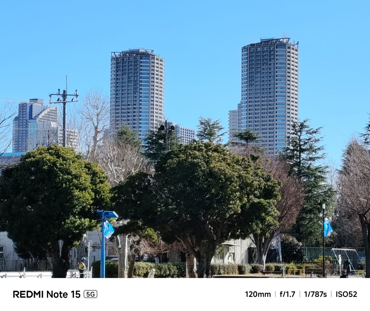REDMI Note 15 Pro 5Gは2倍ズーム時にかなりボヤケた画質でしたが、3倍ズームではかなりよくなっています。REDMI Note 15 Pro 5GやPhone (3a) よりも(木々の部分とか) 塗り絵のような箇所が少ない結果となっています。