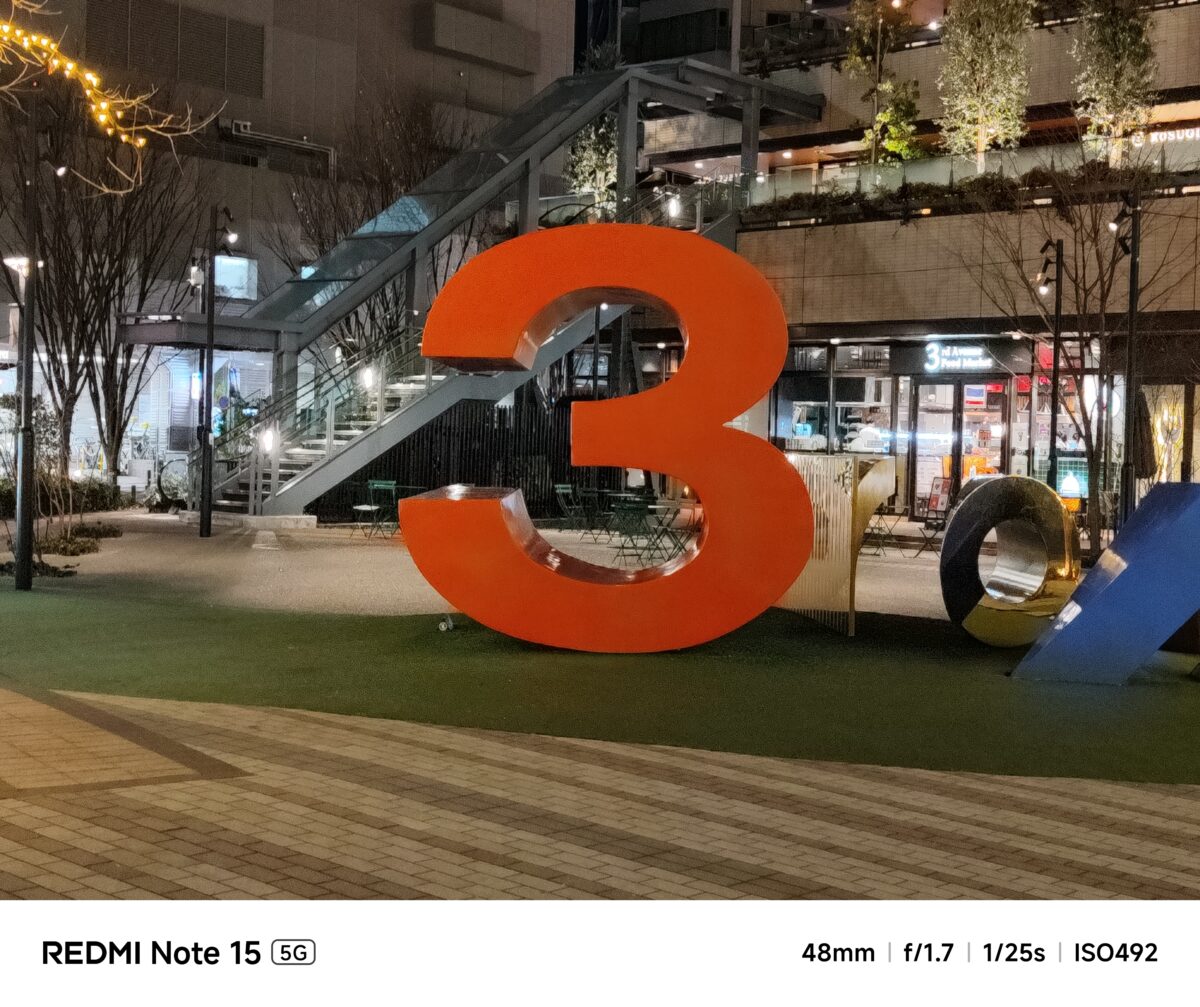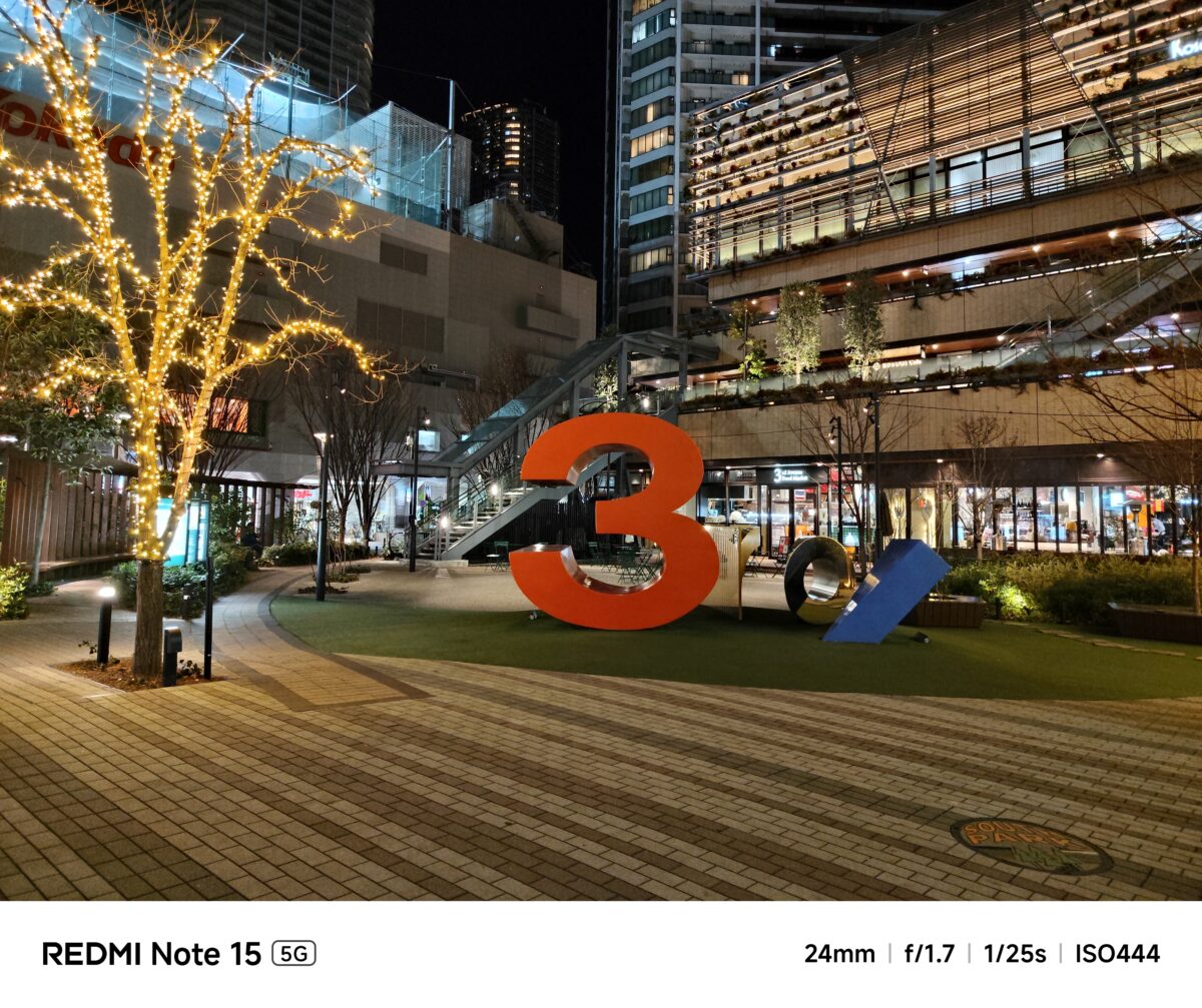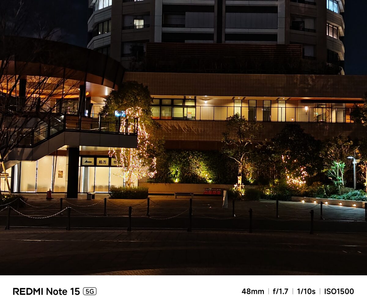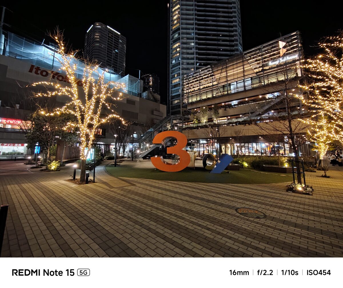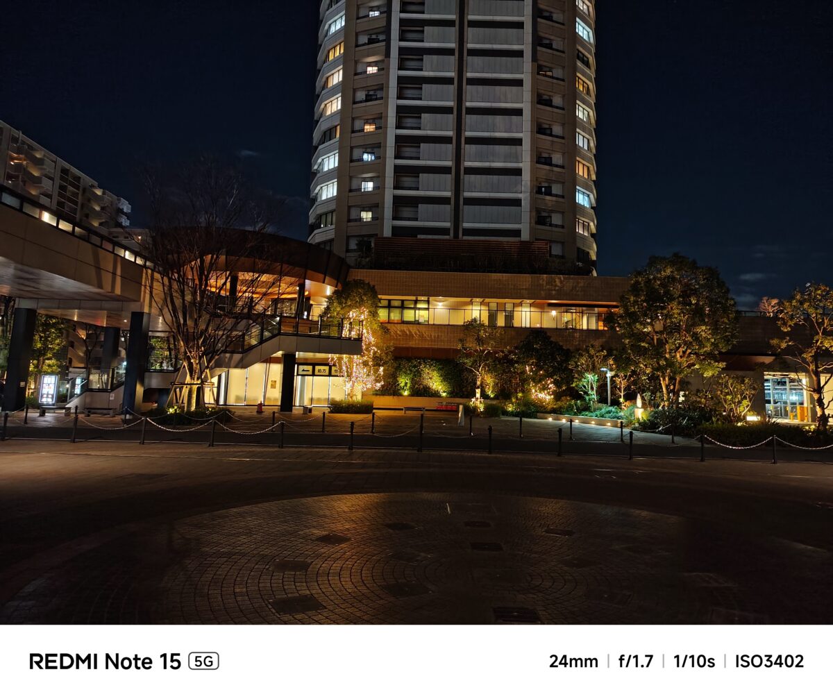 REDMI Note 15 5Gには夜景モード(ナイトモード)は選択できず、自動判定で夜景モードになります。なので、低照度でもそこそこの光量があると自動判定で夜景モードにならずに、通常の写真モードのままでの撮影となる時がありました。