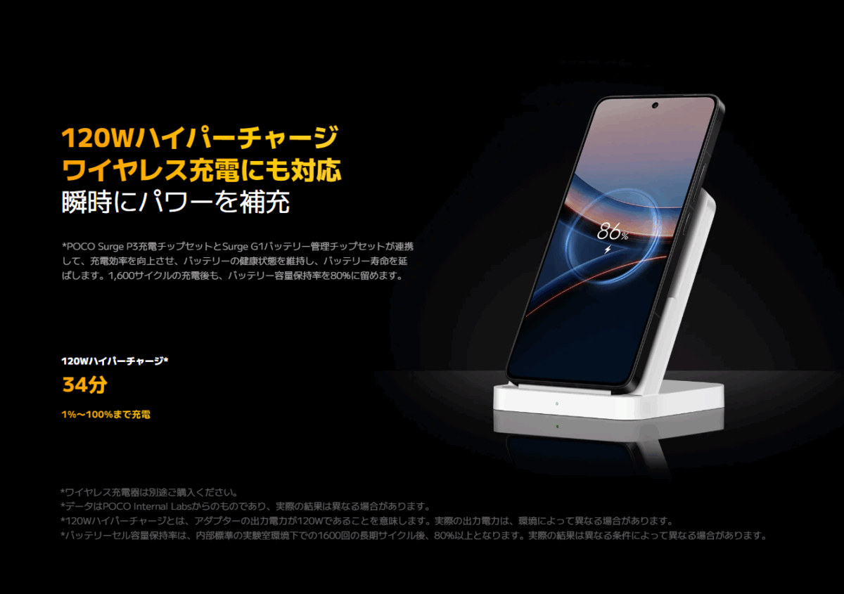 充電は最大120Wの急速充電に対応しています。POCO F7、F7 Proは最大90Wとなっているのでより上位となっています。