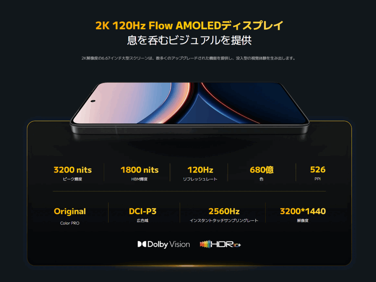 POCO F7 Ultraは6.67インチとスマホ。最大輝度は3200nitと晴天時の野外でも見やすいレベル。リフレッシュレートは最大120Hz。ディスプレイ周りの仕様もハイエンドとして遜色ないレベルとなっています。
