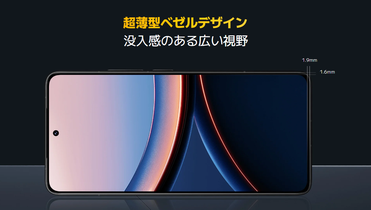 また、超狭ベゼルを採用。左右は1.6mm、上下は1.9mmとなっています。