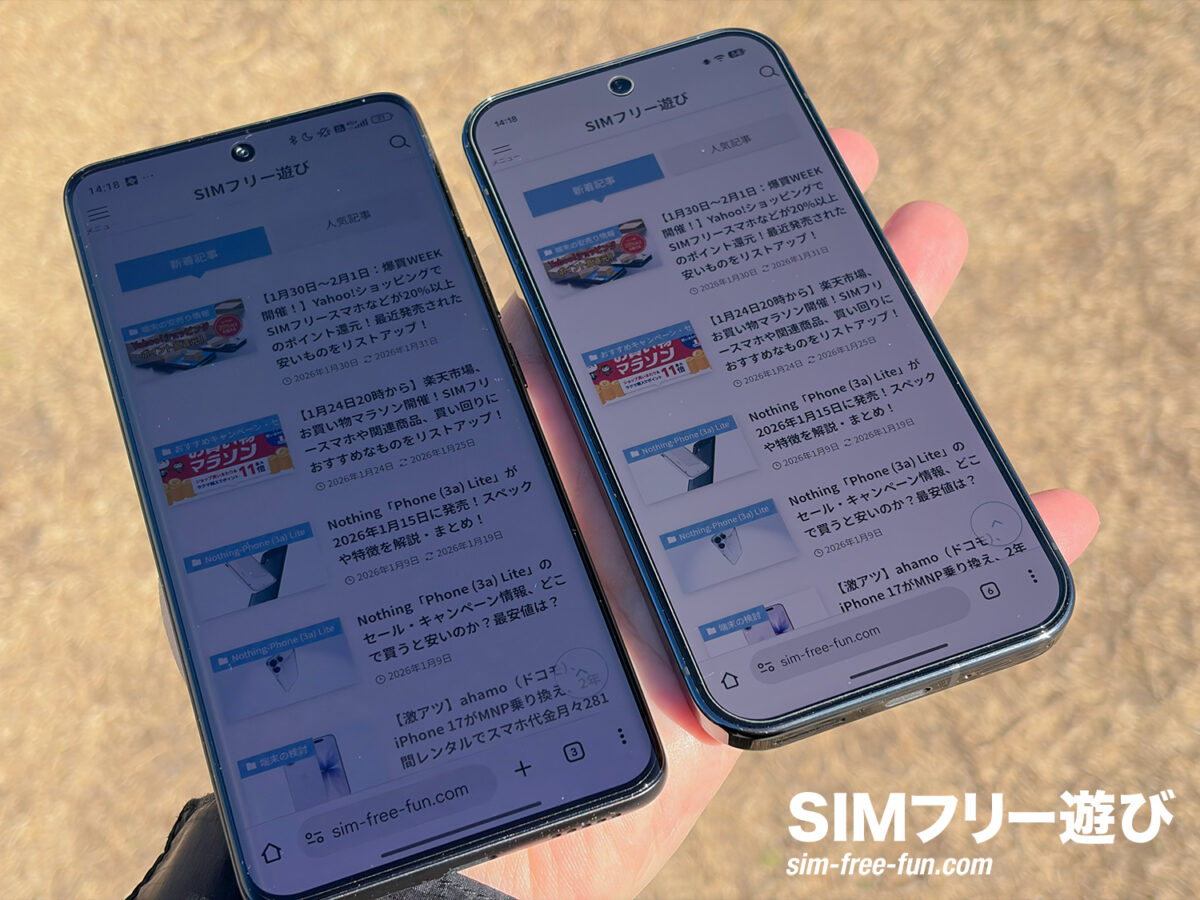 となっています。直射日光下でREDMI Note 15 Pro 5Gの方が明るく見やすいです。ディスプレイの最大輝度の仕様はPro版と異なるということになります。