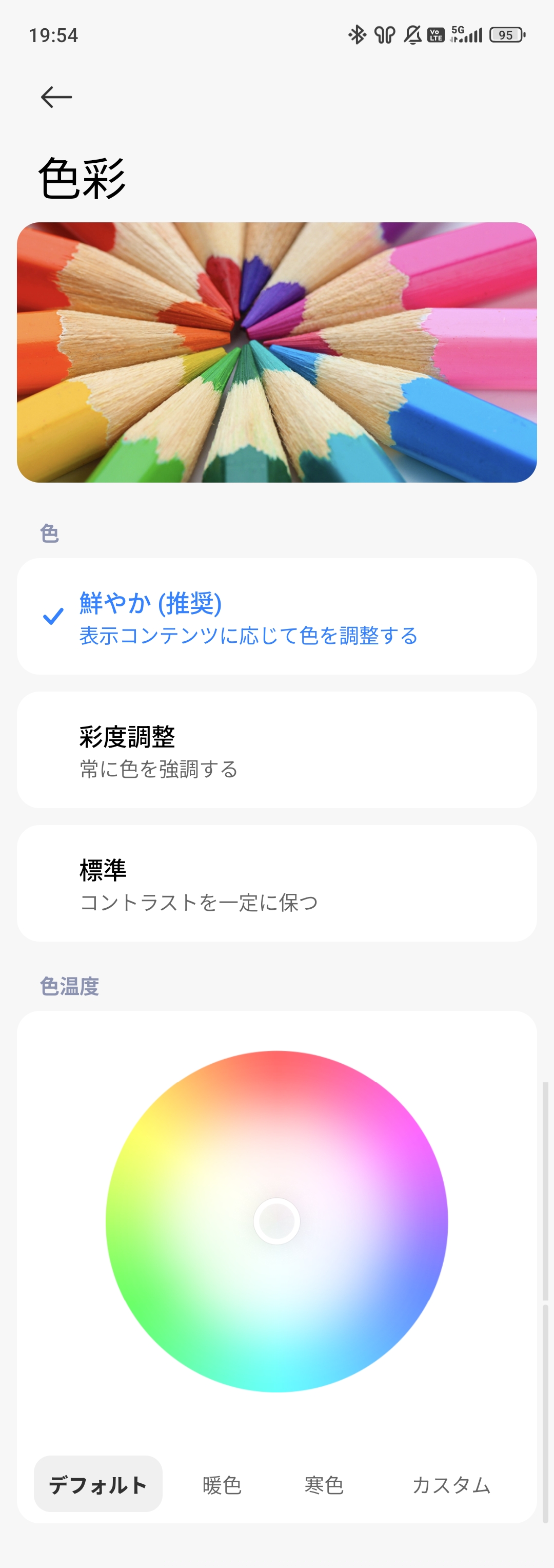 REDMI Note 15 5Gのディスプレイの色味に関しては、上位機種のREDMI Note 15 Pro 5Gと比べると設定項目が少ないですが、他メーカーよりと比べると比較的柔軟に設定することが可能です。