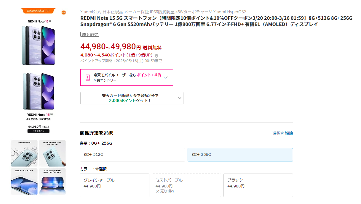 楽天市場の楽天ビック、ジョーシン楽天市場、Xiaomi 公式 楽天市場などでREDMI Note 15 5Gが、