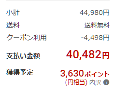 この期間に44,980円にポイント30%還元(12,303pt)で実質32,677円でした。30%還元はやばすぎるぞ…。