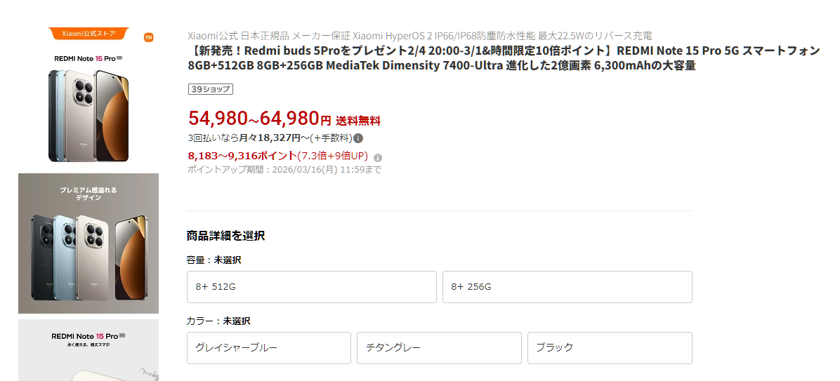 Xiaomi 公式 楽天市場では2026年3月1日までにREDMI Note 15 Pro 5Gを購入すると、特典で「Redmi buds 5 Pro」(定価9980円)が同梱されます。更にポイント10倍に。
