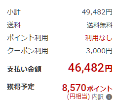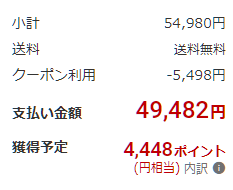 8GB+256GB版では54,980円から10%オフの5,498円が割引になり支払い金額は49,482円に。そこにポイント10%還元(4,448pt)還元され、実質45,034円になります。