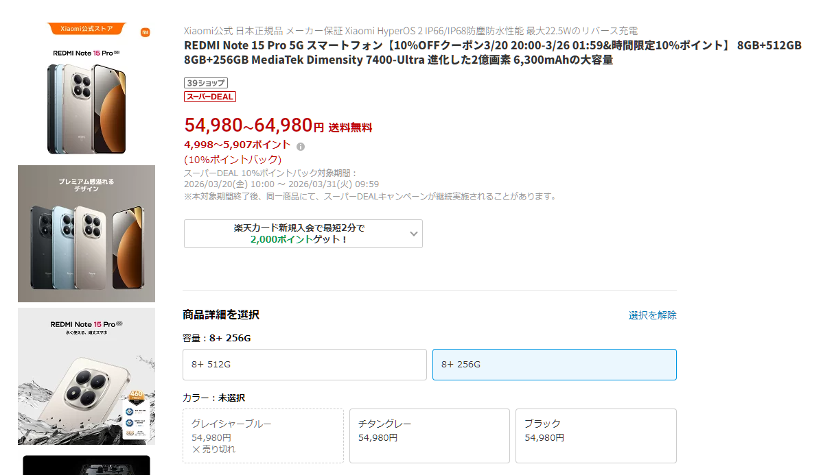 楽天では3/20 20:00~3/26 01:59の期間でお買い物マラソンが実施されており、それに合わせてXiaomi 公式 楽天市場でREDMI Note 15 Pro 5Gがクーポンで10%割引、DEALでポイント10倍になっています。