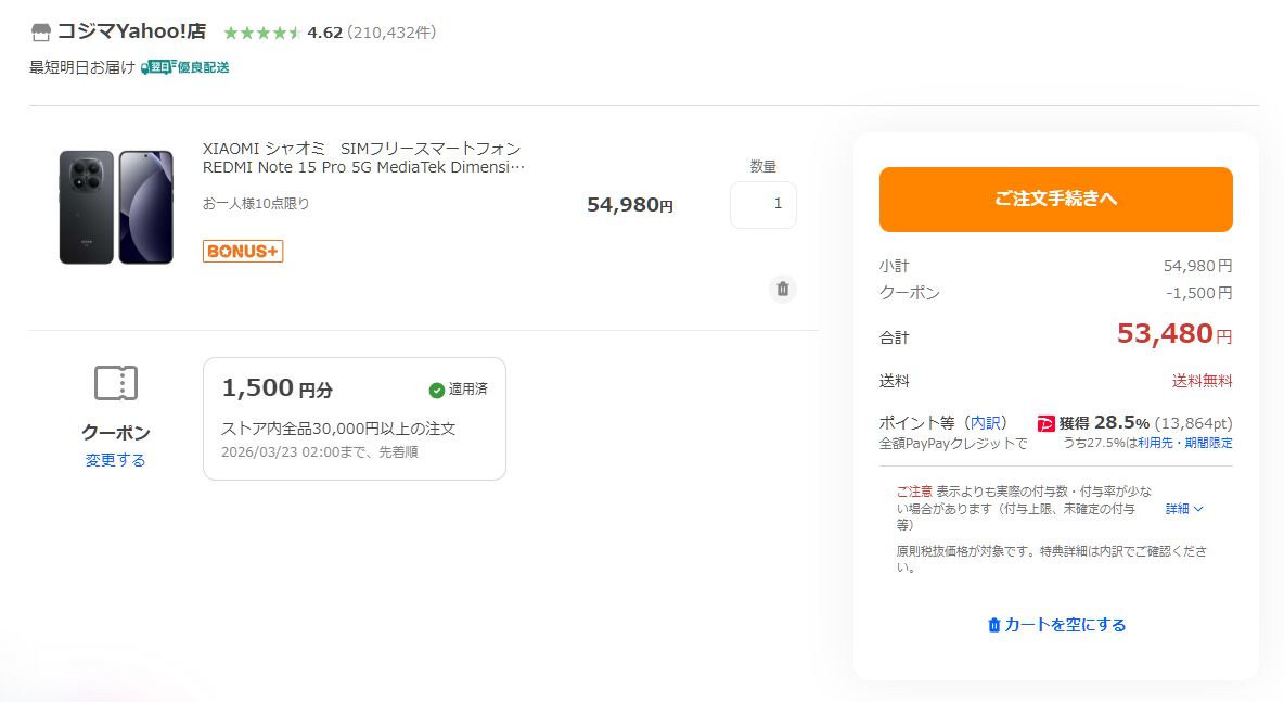 REDMI Note 15 Pro 5Gが54,980円にポイント28%還元(14,041pt)で実質40,939円となっています。