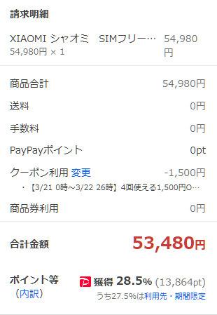 筆者の場合、Xiaomi 公式 楽天市場ではポイント還元が9,140ptとなっていました。
