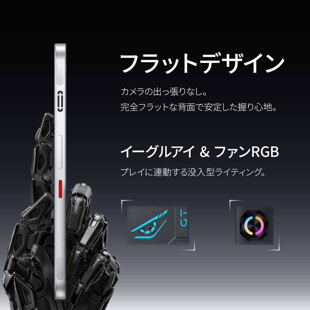 カラー展開は2色のブラック、ホワイト。ゲーミングスマートフォンという通り、背面デザインはゲーミングスマートフォンを彷彿させるデザインに仕上がっています。